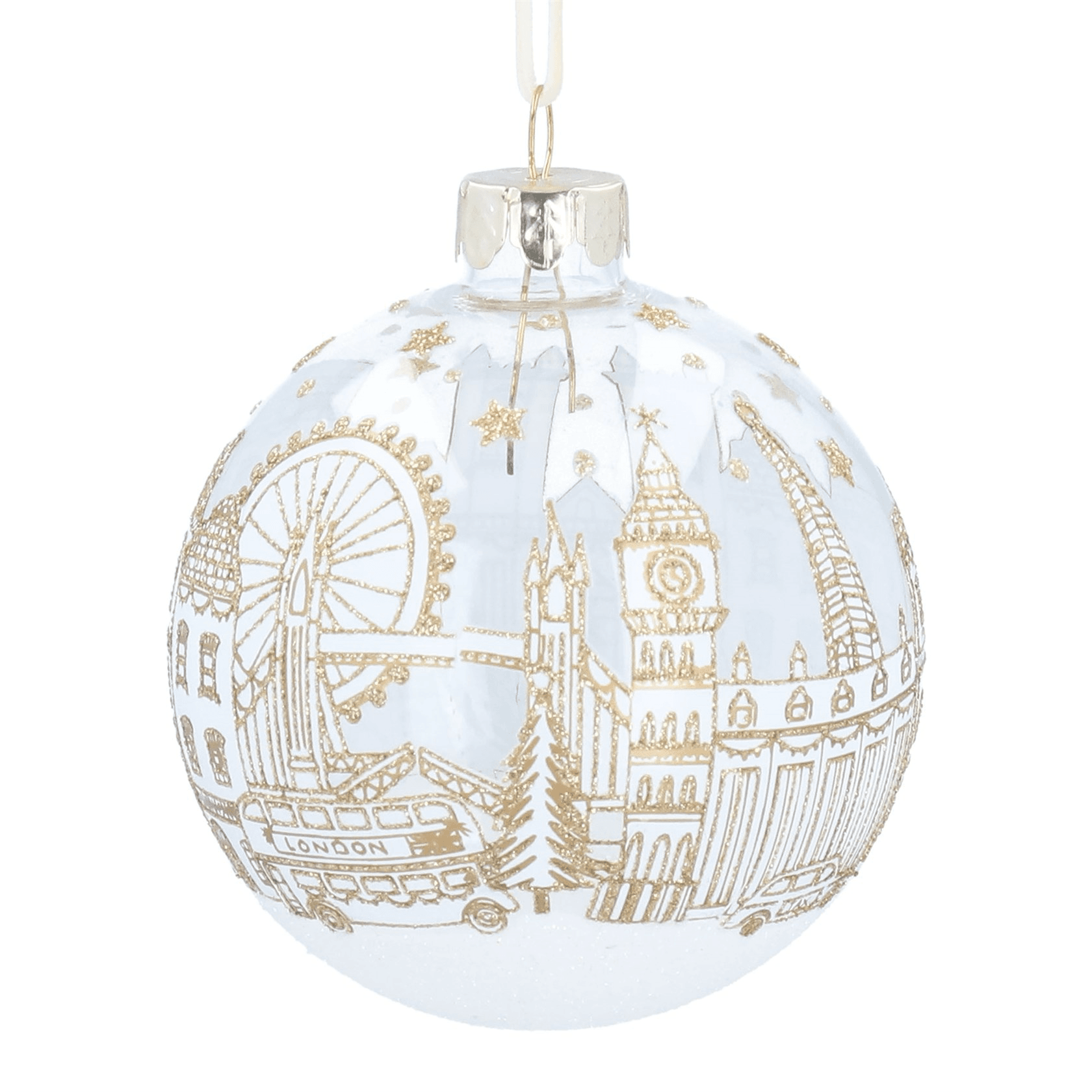 Beautifully designed and by Gisela Graham London, this clear bauble features the iconic London skyline in gold paint and glitter detailing. Updated for 2025.
